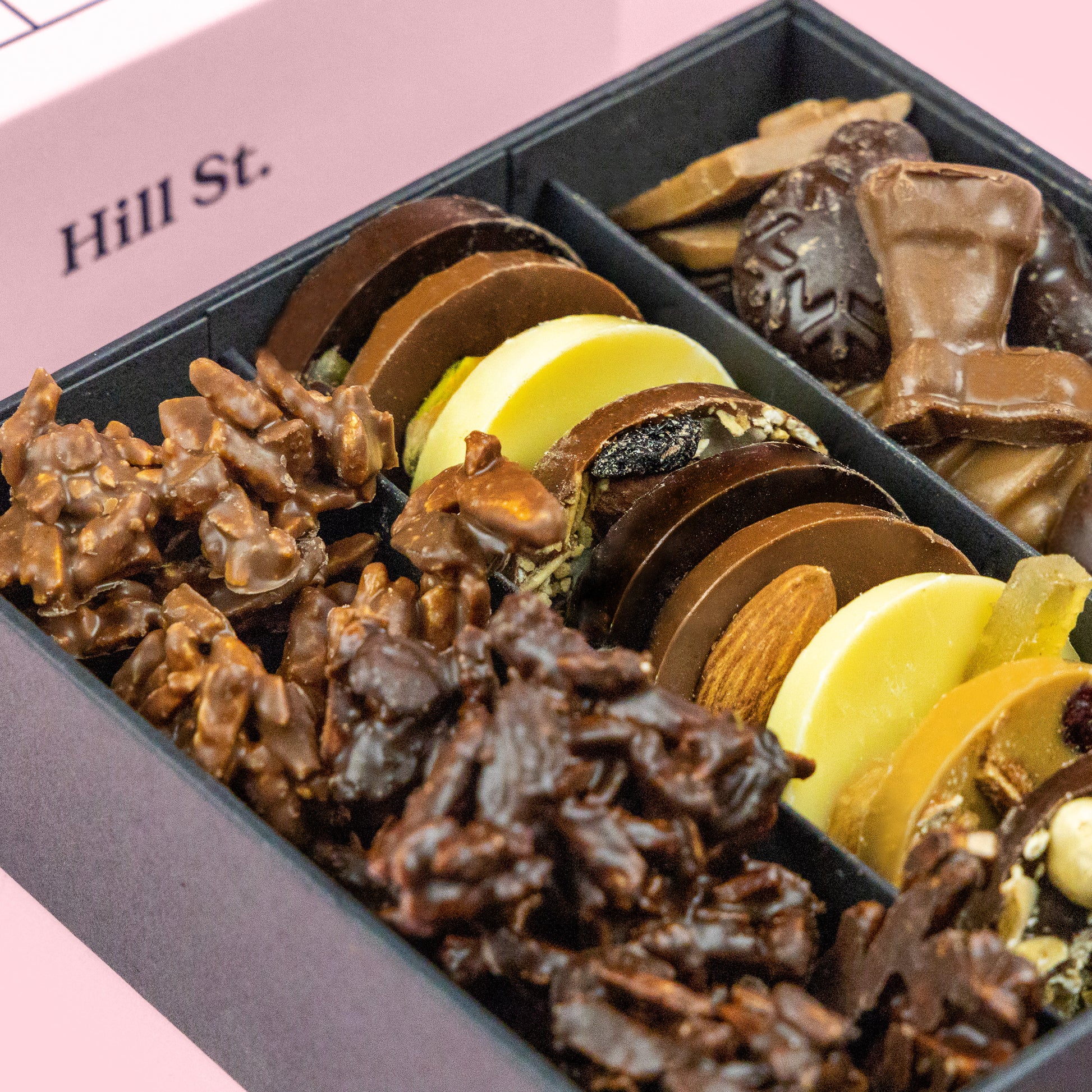 Hill St. Dark chocolate blend (66% cocoa) (sugar, cocoa butter, emulsifier: soya lecithin, natural vanilla extract), Hill St. Milk chocolate blend (40% cocoa) (sugar, cocoa butter, whole milk powder, emulsifier: soya lecithin, natural vanilla extract), Hill St. caramel chocolate blend (minimum 32% cocoa) (sugar, cocoa butter, whole milk powder, dried skimmed milk, whey, butter, emulsifier: soya lecithin and natural vanilla extract), Hill St. white chocolate blend (minimum 35% cocoa) (sugar, cocoa butter, whole milk powder, emulsifier: soya lecithin and natural vanilla extract). Orange/lemon confit (Hill St. dark chocolate, orange/lemon peel, sucrose, fructose, dextrose, maltose, preservative: potassium sorbate (E202), acid: citric acid (E330). Stem ginger (ginger, sugar, water). Pearls (Hill St. chocolate blends, whole grain wheat, maize semolina, sugar, glucose syrup, fat-reduced cocoa powder, arabic gum). Fudge (sugar, sweetened condensed milk (milk, sugar), fondant (sugar, glucose syrup, water), glucose syrup, palm oil (RSPO certified sustainable palm oil), butter oil (from Milk), natural flavouring). Almond rocks (Hill St. chocolate blends, caramelised almonds [almonds, sugar, water], orange confit, sultanas). Mixed jewels (Hill St. chocolate blends, orange/lemon confit, sunflower oil, butter, Essex honey, maple syrup, whole cane sugar, salt, vanilla extract, black sugar cane, Jumbo oats (rapeseed oil, desiccated coconut, seeds [pumpkin, sunflower, golden linseeds], nuts [cashew nut pieces, almond pieces, hazelnut pieces, walnut pieces], fructose, black treacle, chicory fibre), Valencia almonds, pistachio, hazelnuts, pecan nuts, walnuts, sesame seeds, grated coconut, raisins, peach, fig, ginger, mango, apricots, blueberries, cherries, cranberries). Chocolate coated nuts (Hill St. chocolate blends, almonds, hazelnuts, Brazil nuts, sugar, water, praline [almonds, hazelnuts, sugar, water, salt], cocoa powder). Wafer crisp (Hill St. dark chocolate blend (66% cocoa minimum). Cocoa beans, sugar, cocoa butter, emulsifier; soya lecithin, natural vanilla extract, wafer crisp (wheat flour, sugar, concentrated butter (milk), milk sugar, milk proteins, salt; malt extract (barley), raising agent: E500ii).