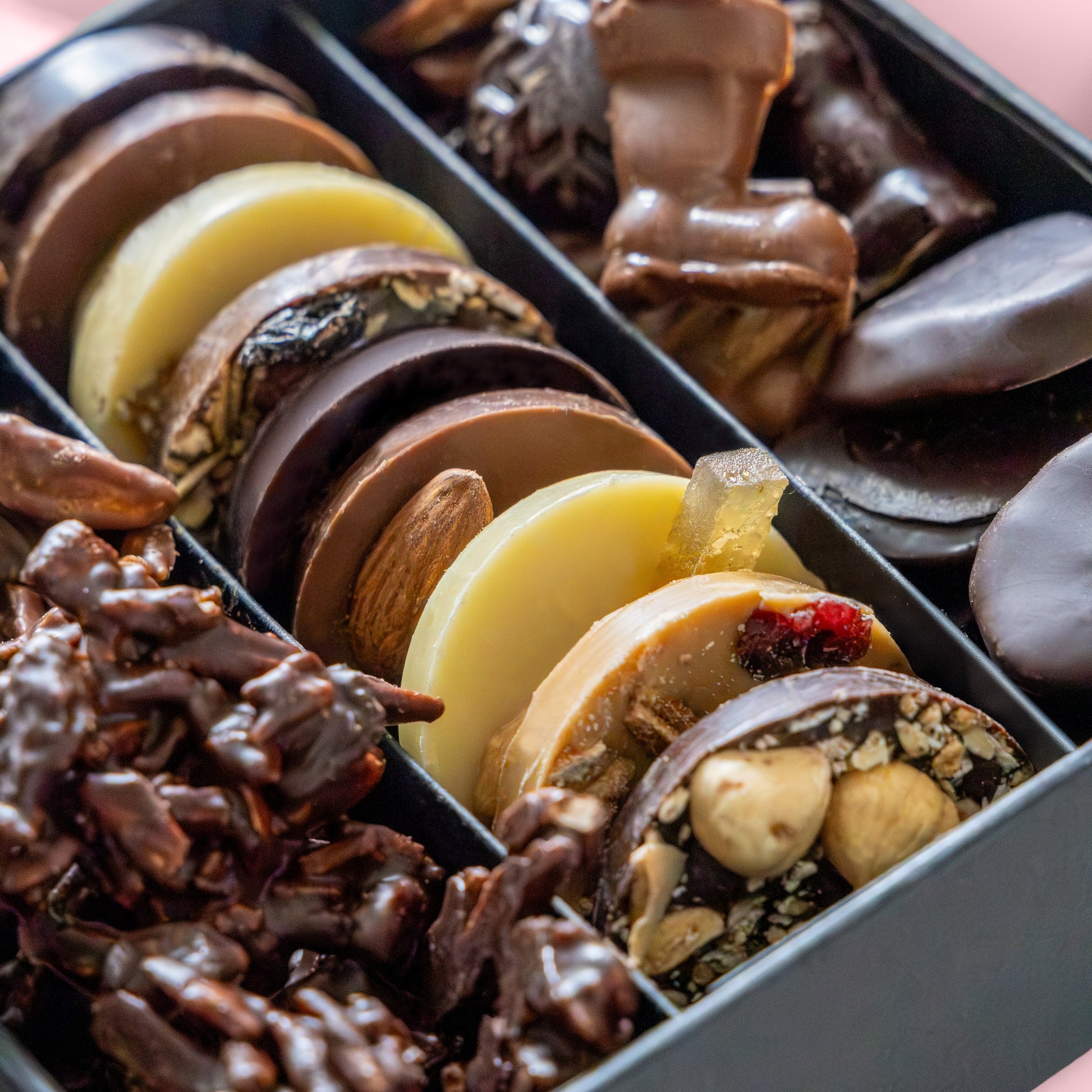 We have included a wonderful selection of our decorated jewels, almonds rocks, chocolate coated ginger confit, and festive moulded chocolates in dark, milk, caramel & white chocolate.